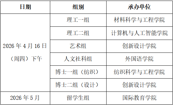1. 论坛由承办单位组织,硕士生以理工一组、理工二组、艺术组、人文社科组和留学生组分组开展,博士生以博士一组(纺织)、博士二组(设计)分组开展,具体时间、地点以学术预告海报发布,安排如下: