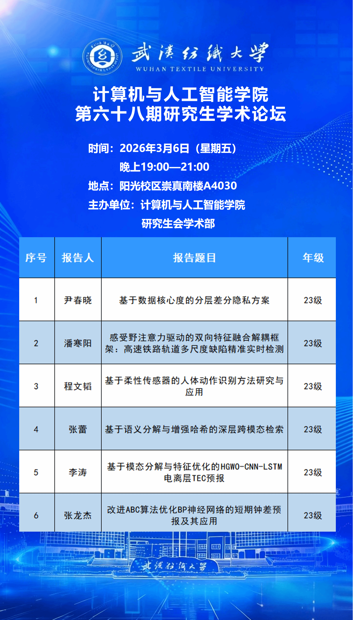 学术预告:第1076期研究生学术论坛暨计算机与人工智能学院2026年第2期研究生学术论坛