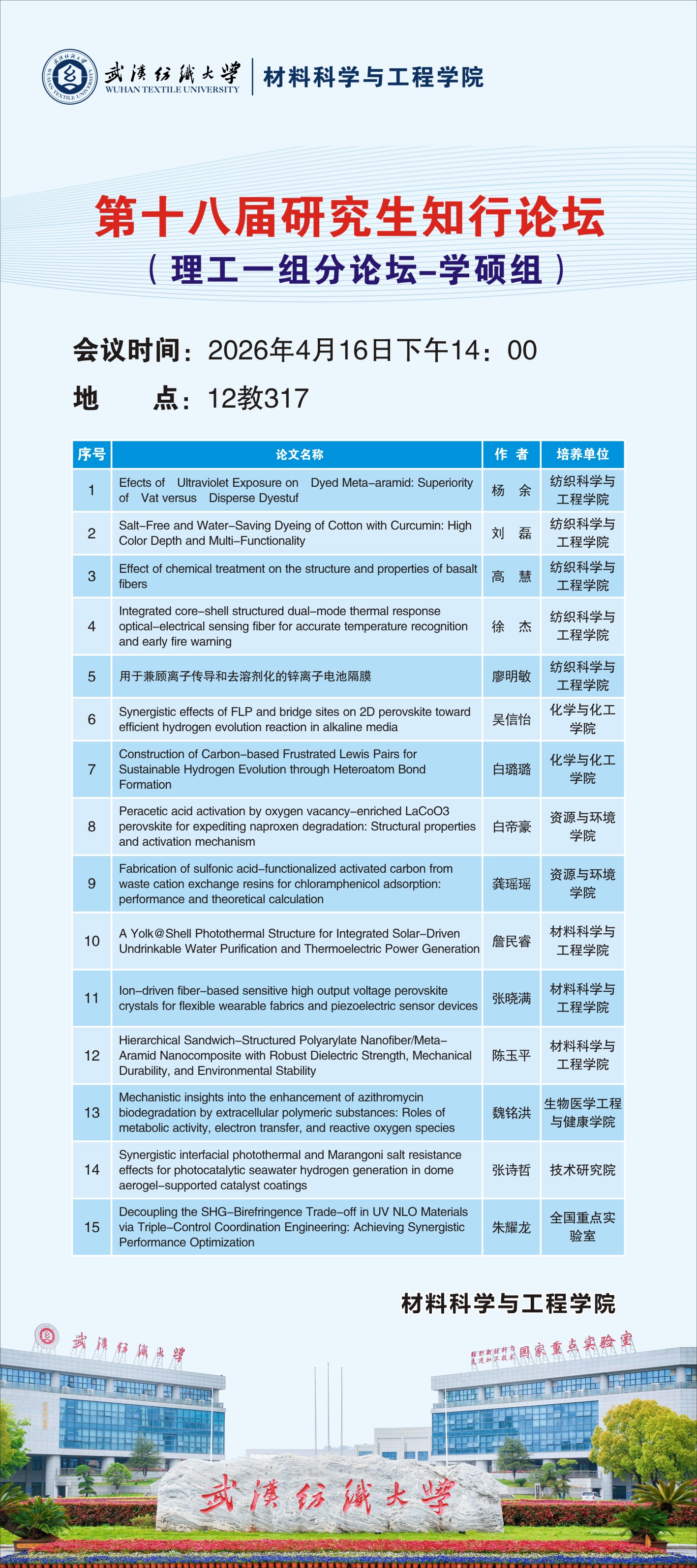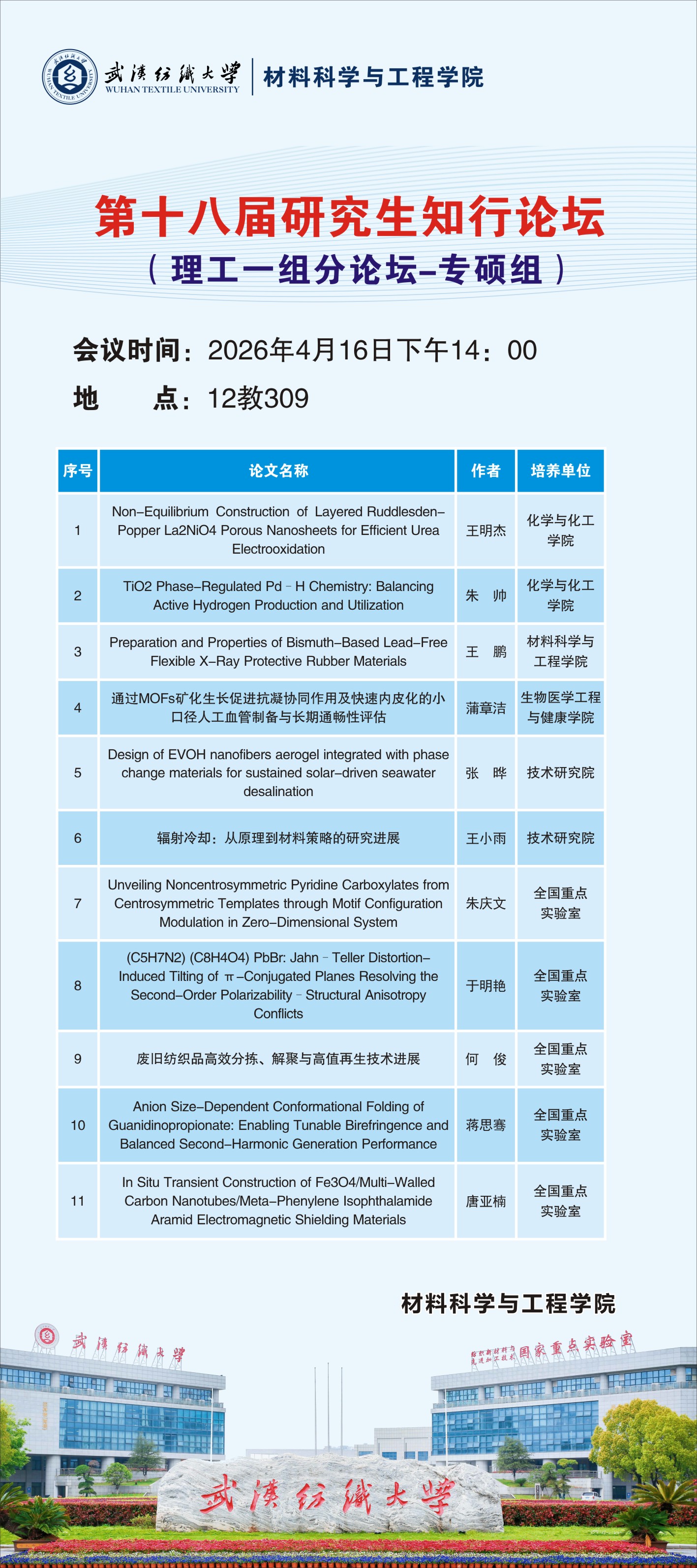 学术预告:武汉纺织大学第十八届研究生知行论坛理工一组分论坛——第1118期研究生学术论坛暨材料科学与工程学院2026年第6期研究生学术论坛