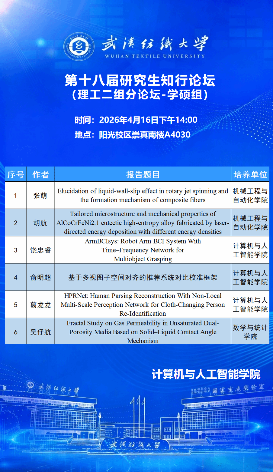 学术预告:武汉纺织大学第十八届研究生知行论坛理工二组分论坛——第1119期研究生学术论坛暨计算机与人工智能学院2026年第6期研究生学术论坛