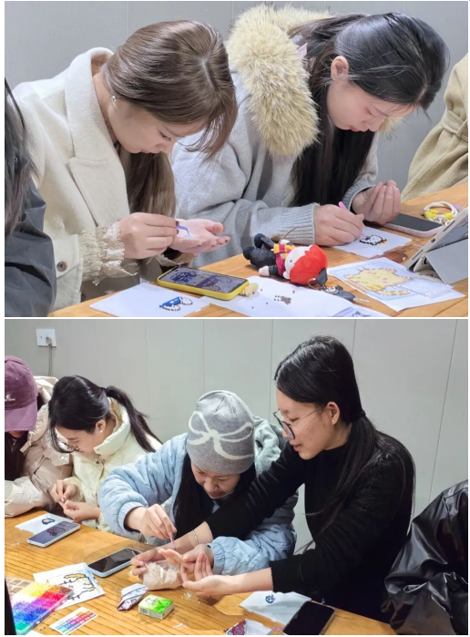 创作过程中,互帮互助的温馨场景随处可见:同学们热心分享配色心得、主动协助图案设计,工作人员穿梭其间提供技术支持。手工坊不仅是创意的工场,更是情感交流的港湾,陌生的隔阂在协作中消融,真挚的情谊在互动中建立。这种互助协作的精神,正是导学思政所倡导的集体凝聚力与友爱精神的生动体现,让研究生在实践中体会团结的力量。